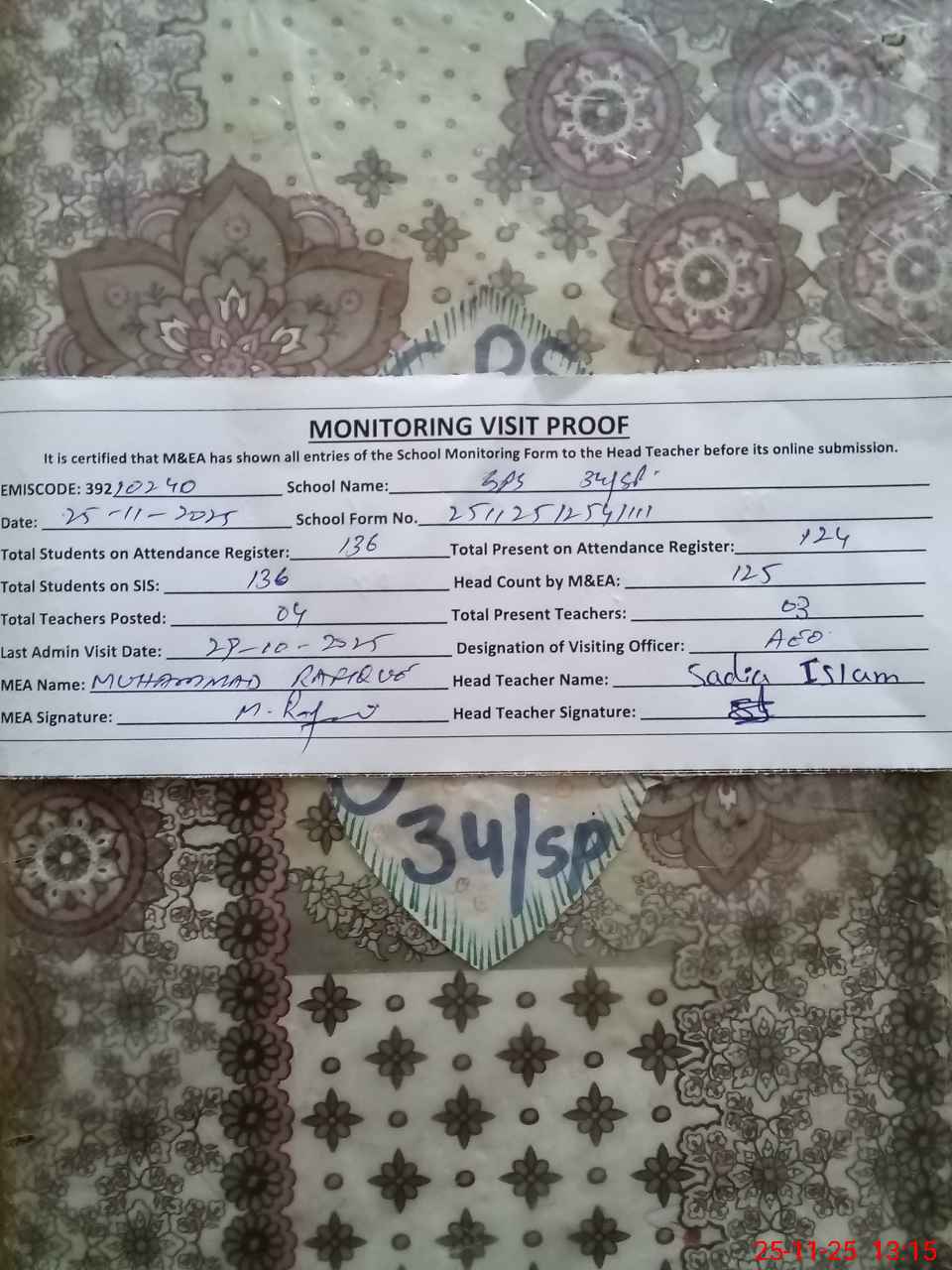 | EMIS Code: 39210240 | Name of School: GPS CHAK NO. 34 SP | |||