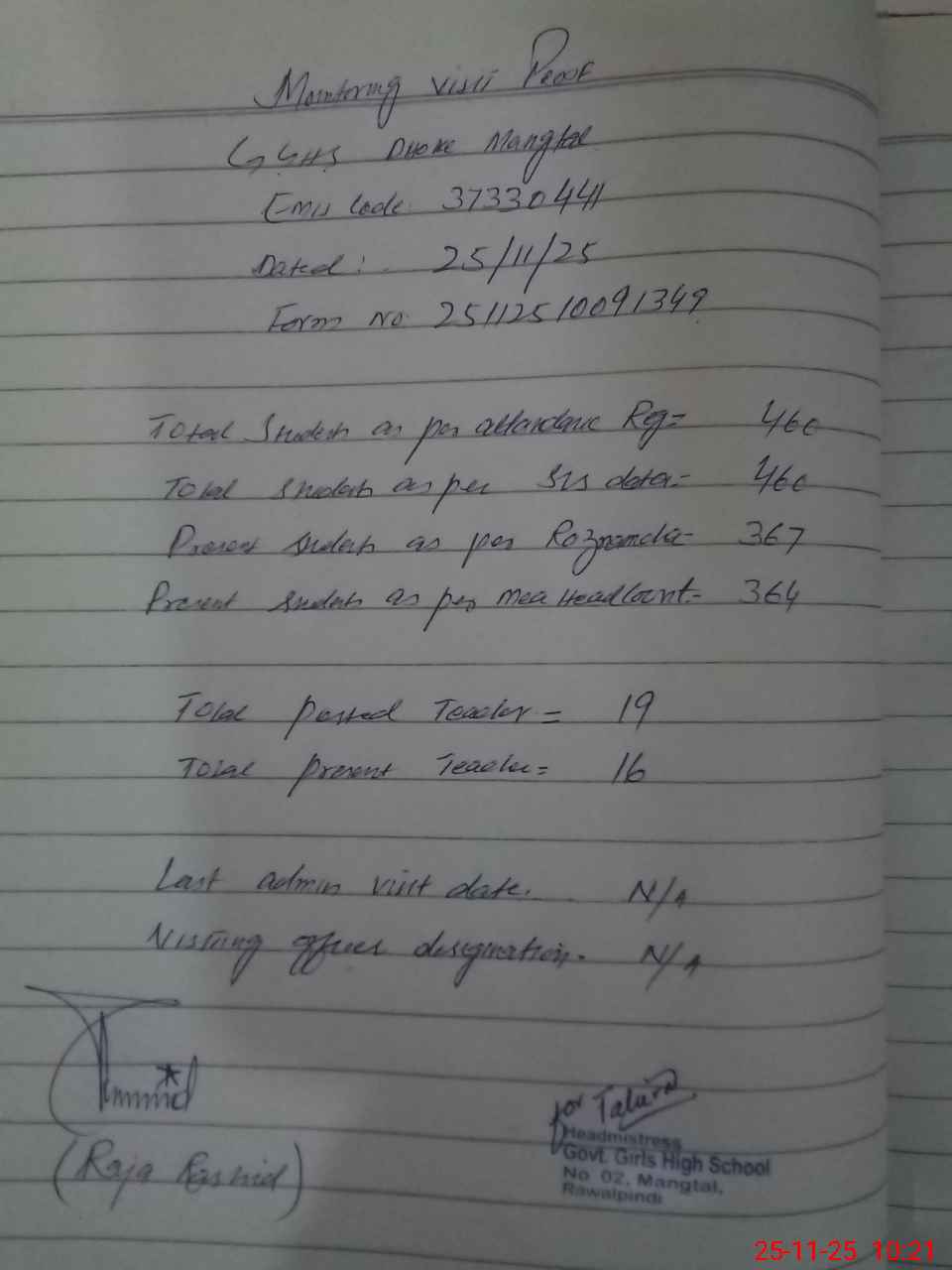 | Attendance Register | Head Teacher | MEA with School | Visit Proof |