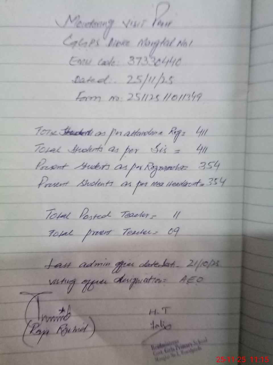 | Attendance Register | Head Teacher | MEA with School | Visit Proof |