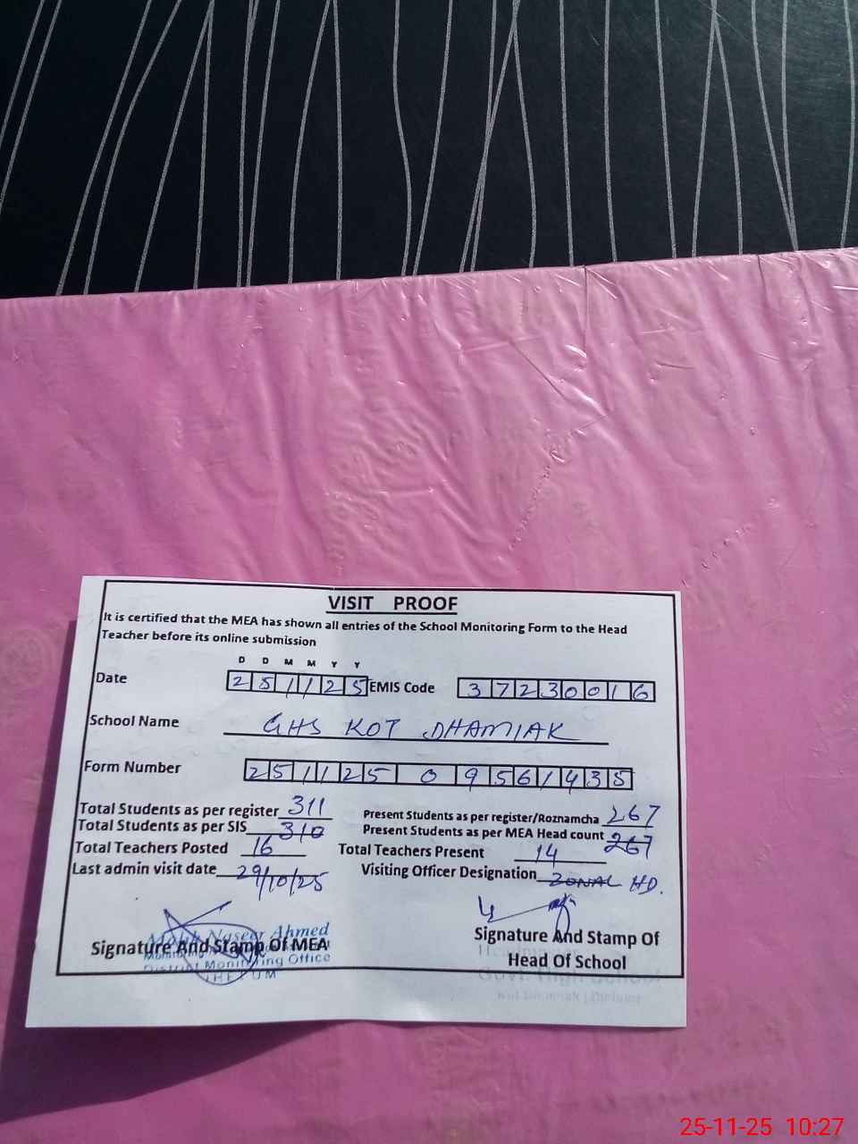 | Certified that this School was Inspected by the Undersigned MEA/DMO Today and the Information Stated Above is as Per Record. | |||||