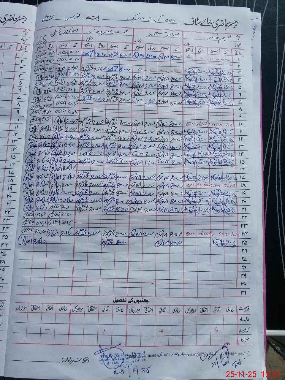 | CNIC | Full Name | Designation | R/C | Absence During Last Calender Month |