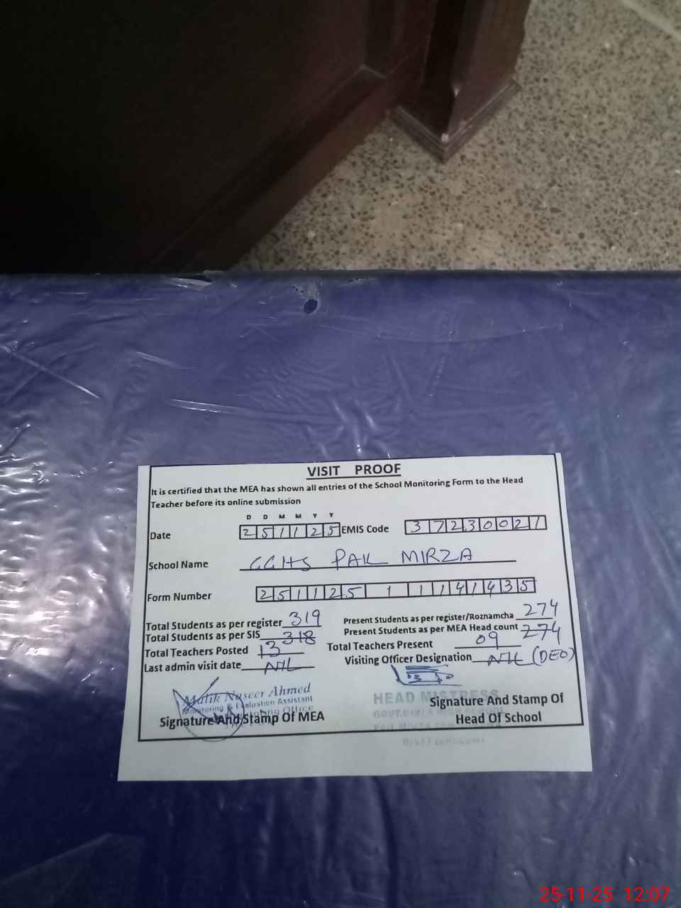 | Attendance Register | Head Teacher | MEA with School | Visit Proof |