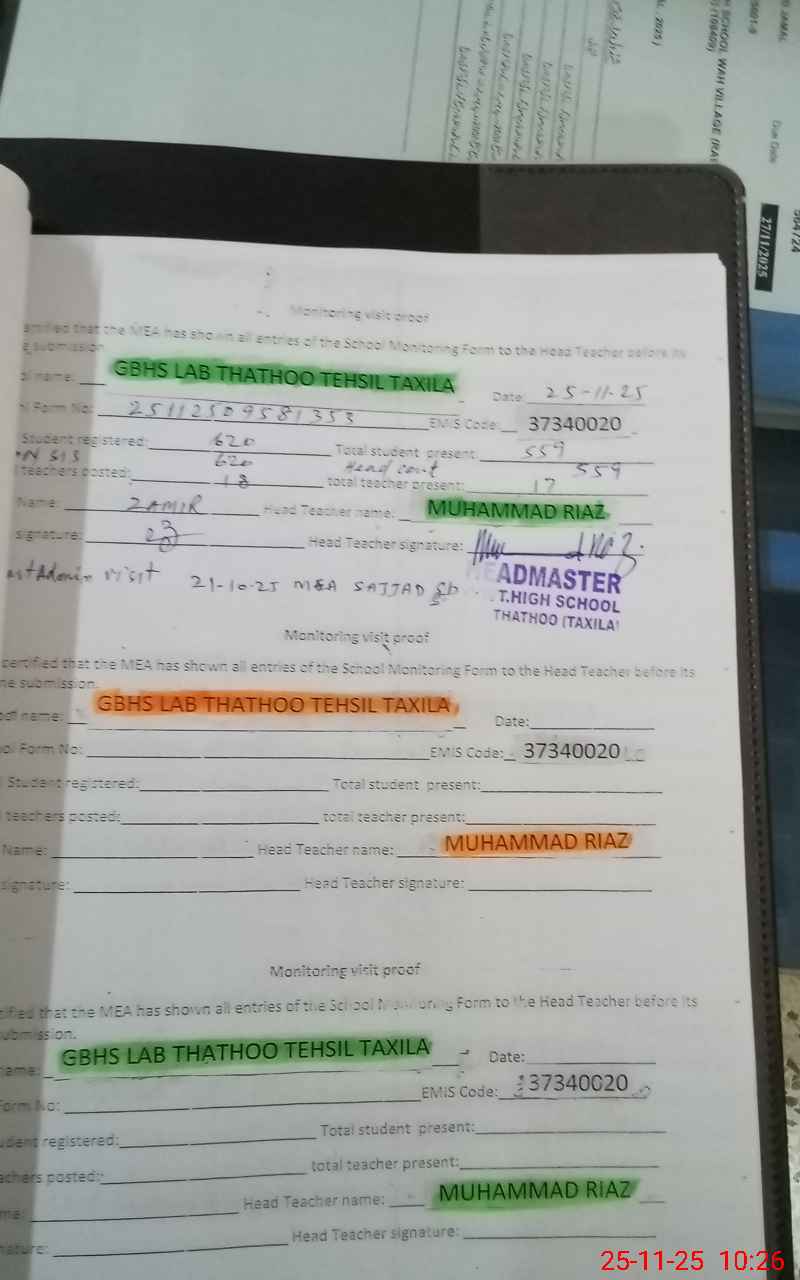 | Monitoring Date: 25-11-2025 | Start Time: 25-11-2025 09:34 AM | End Time: 25-11-2025 10:27 AM | Name of MEA: Za**** Ah**** | |