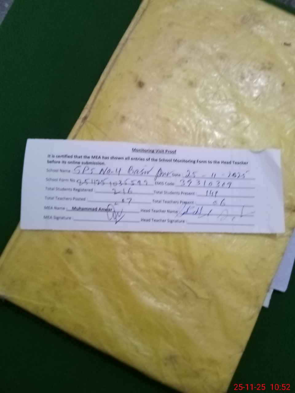 | Attendance Register | Head Teacher | MEA with School | Visit Proof |