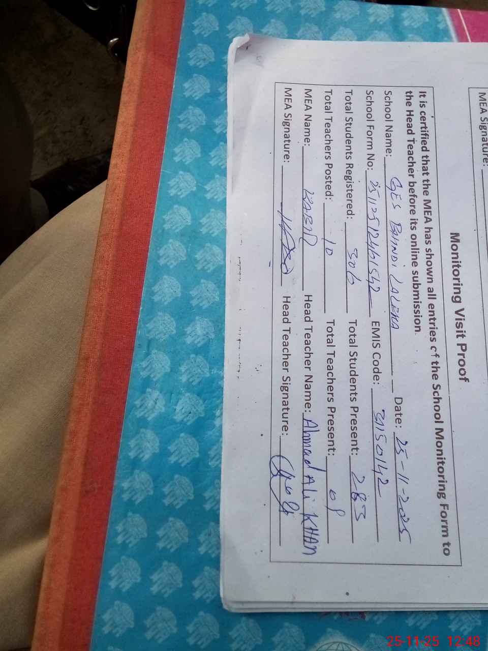 | Attendance Register | Head Teacher | MEA with School | Visit Proof |