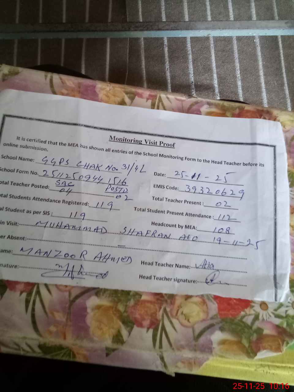 | Attendance Register | Head Teacher | MEA with School | Visit Proof |