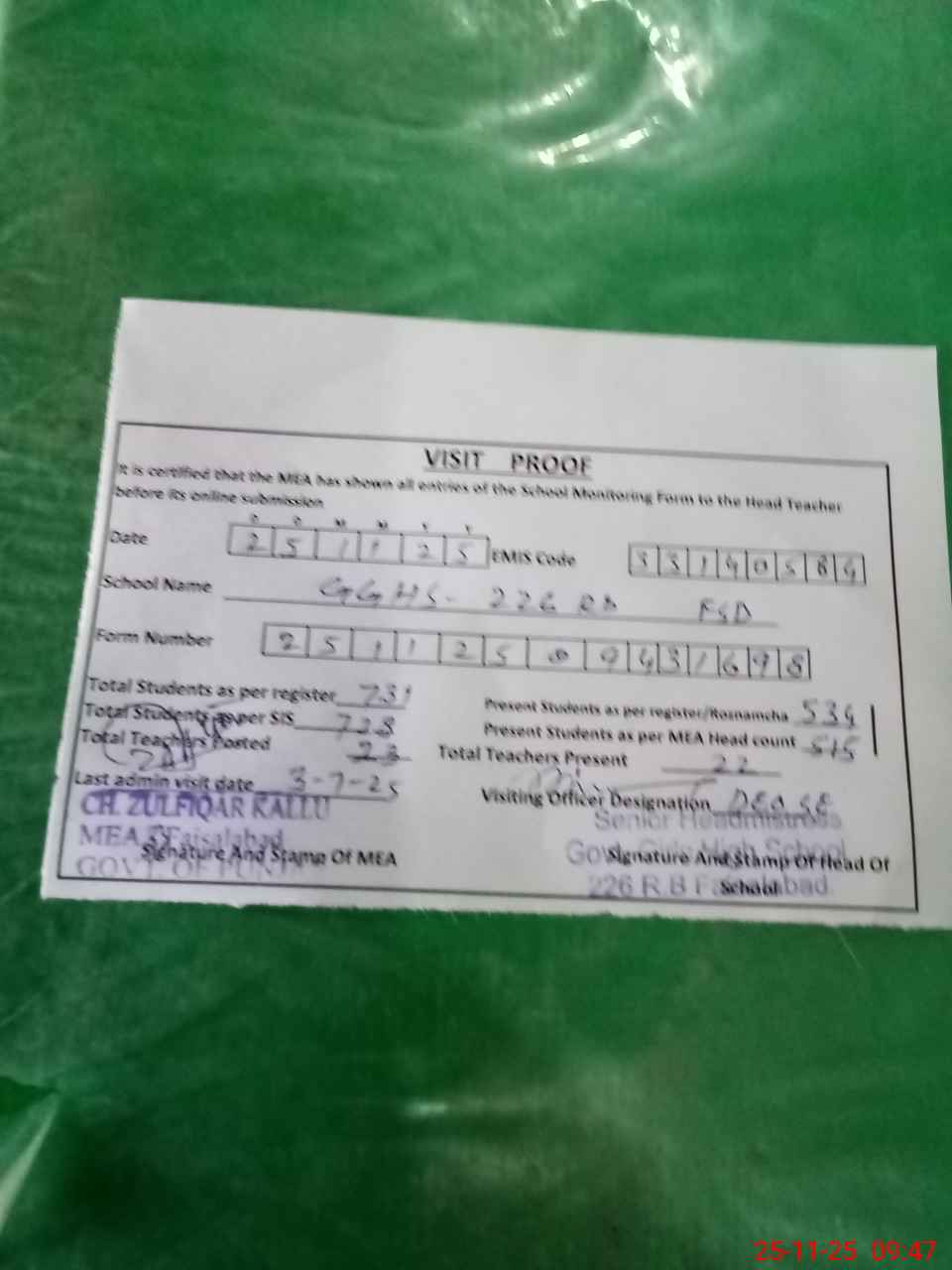 | Attendance Register | Head Teacher | MEA with School | Visit Proof |