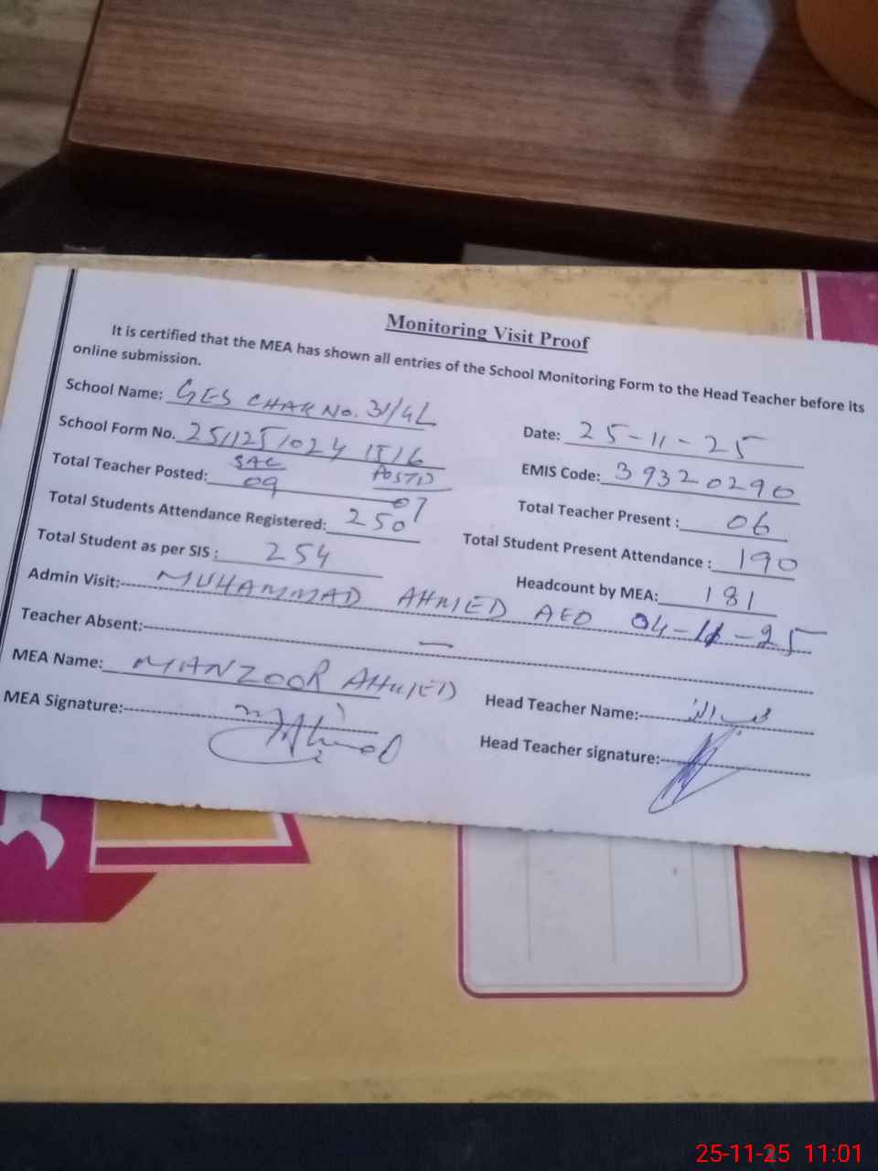 | Attendance Register | Head Teacher | MEA with School | Visit Proof |
