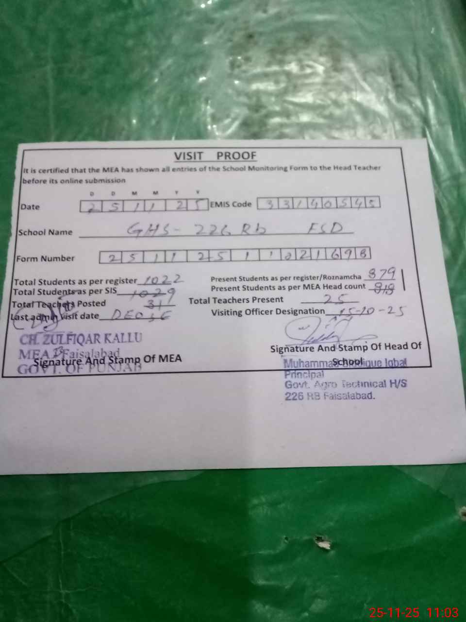| Attendance Register | Head Teacher | MEA with School | Visit Proof |