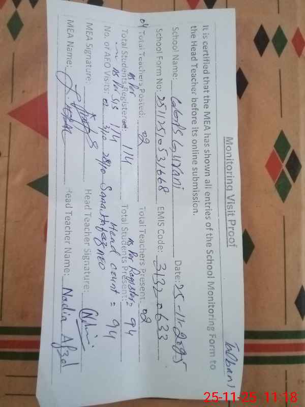 | Attendance Register | Head Teacher | MEA with School | Visit Proof |