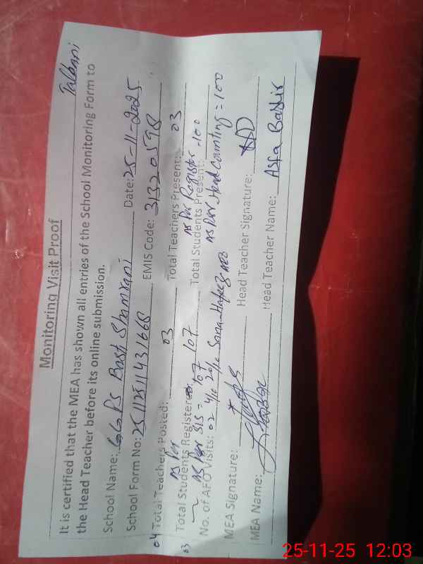 | Attendance Register | Head Teacher | MEA with School | Visit Proof |