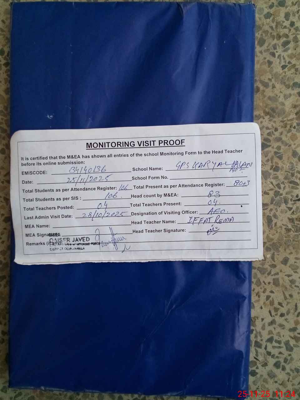 | Attendance Register | Head Teacher | MEA with School | Visit Proof |