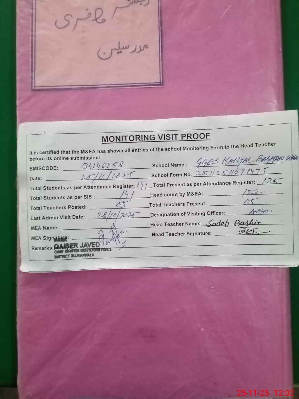 | Attendance Register | Head Teacher | MEA with School | Visit Proof |