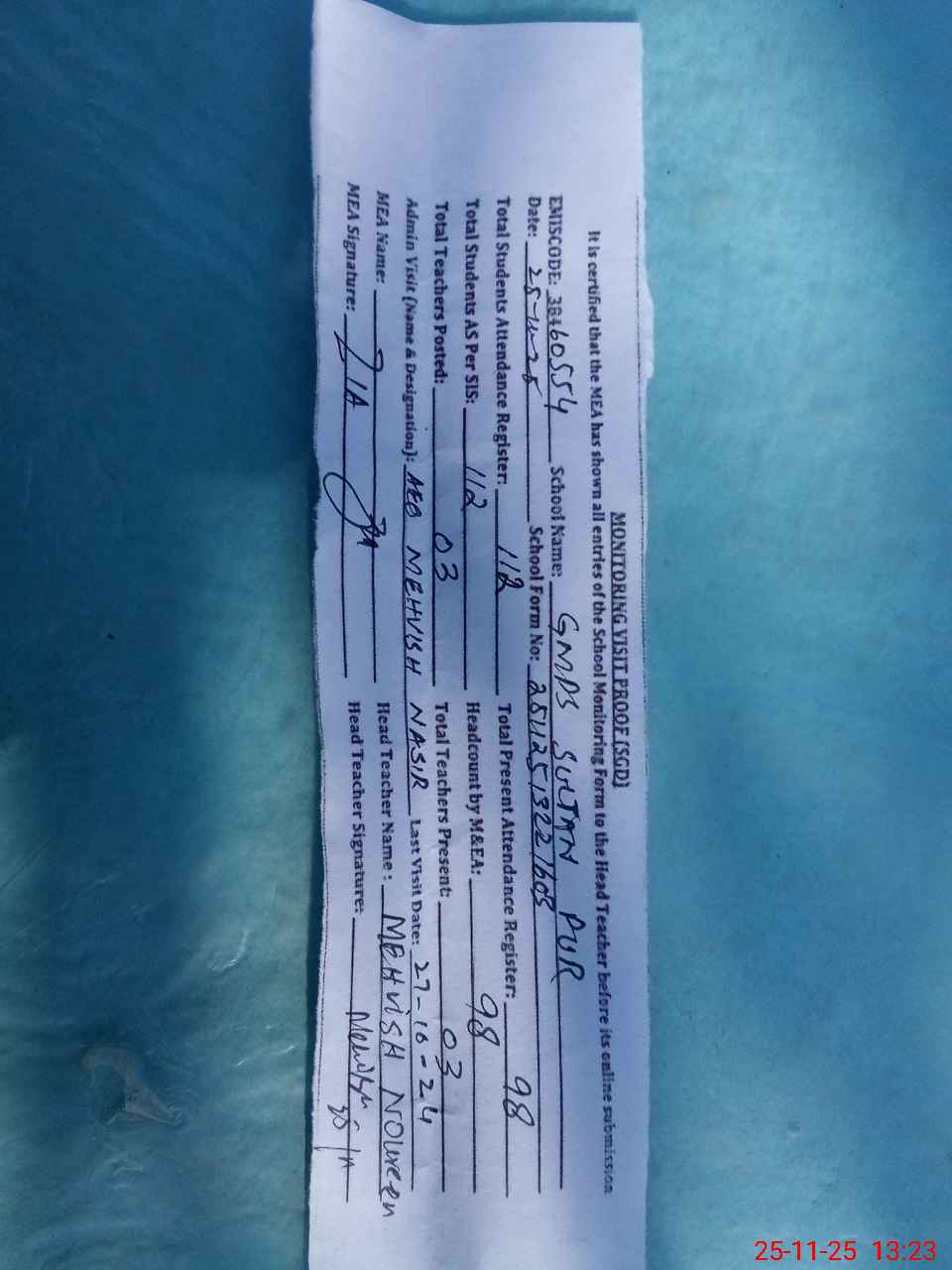 | Attendance Register | Head Teacher | MEA with School | Visit Proof |