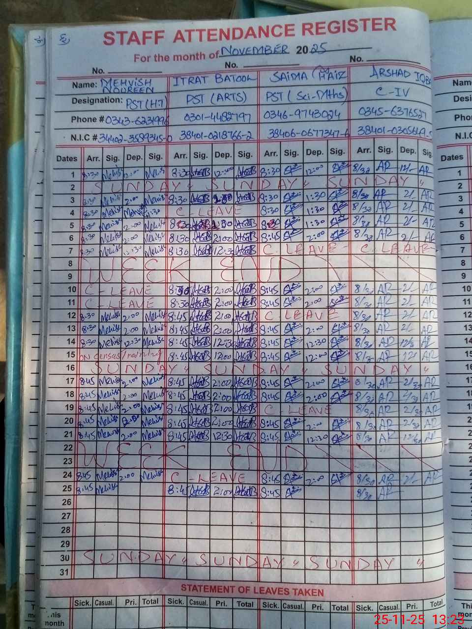 | CNIC | Full Name | Designation | R/C | Absence During Last Calender Month |