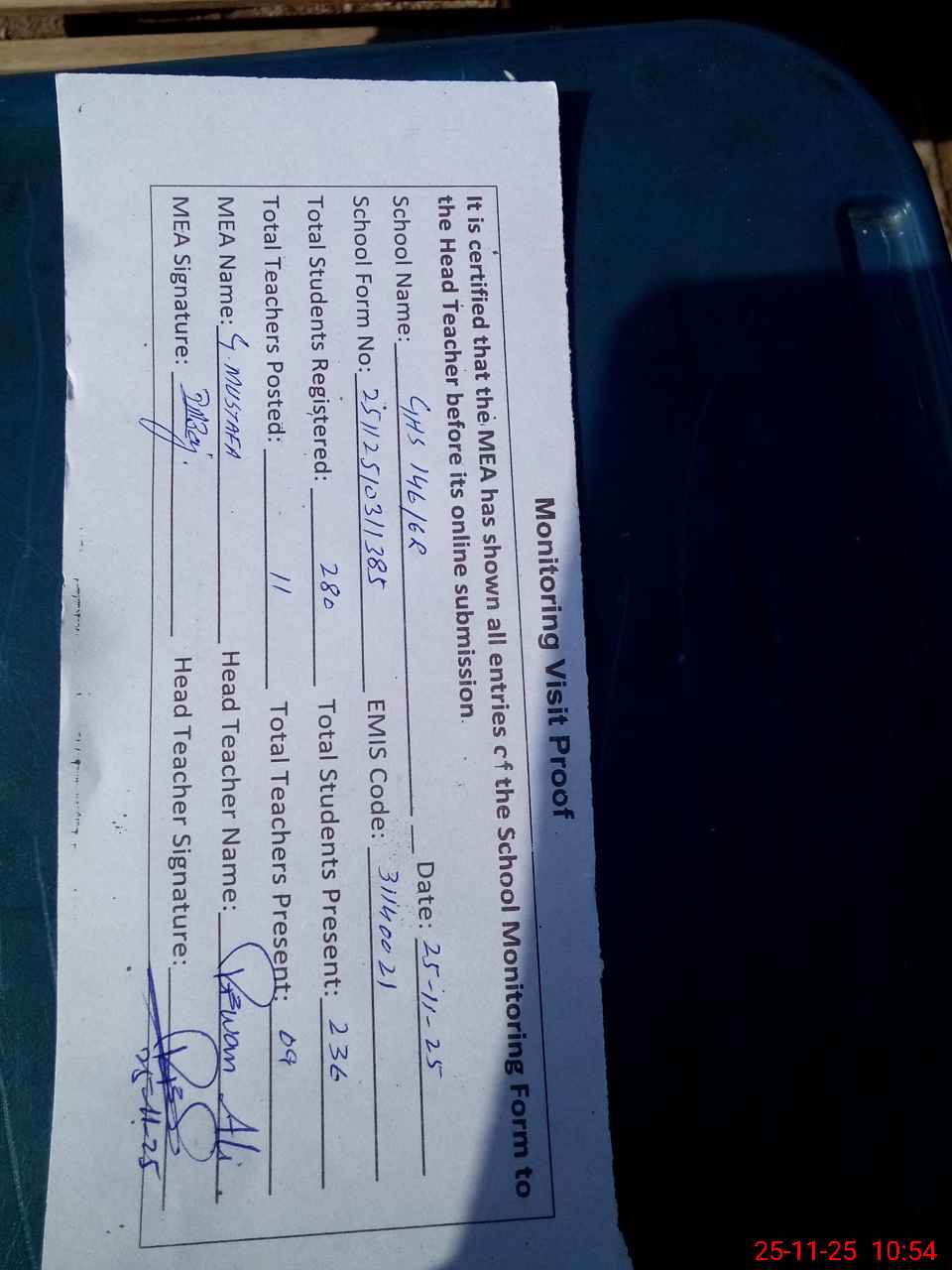 | Attendance Register | Head Teacher | MEA with School | Visit Proof |