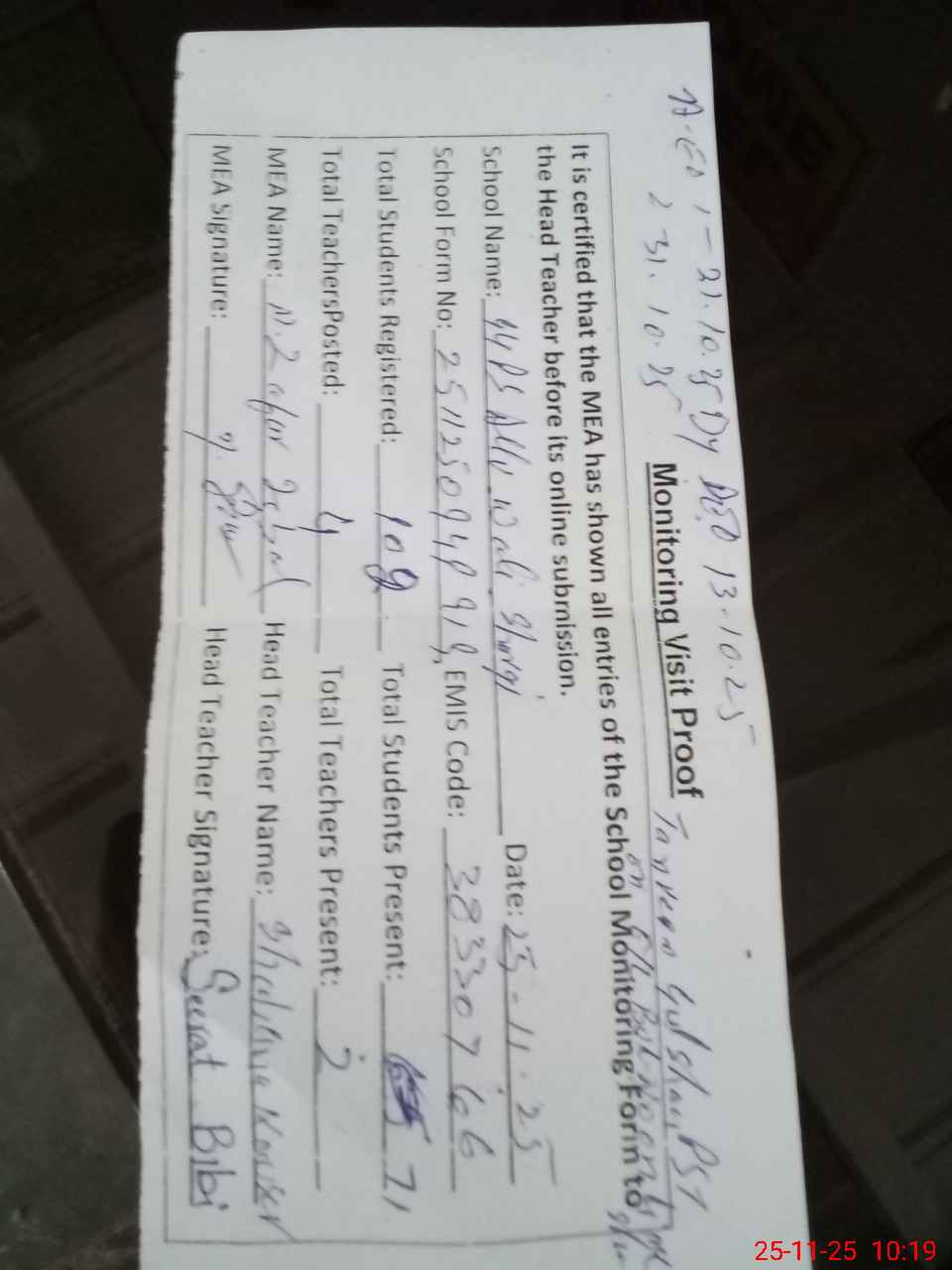 | Monitoring Date: 25-11-2025 | Start Time: 25-11-2025 09:49 AM | End Time: 25-11-2025 10:21 AM | Name of MEA: Mu**** Za**** Iq**** | |