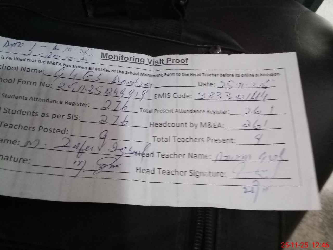 | Attendance Register | Head Teacher | MEA with School | Visit Proof |