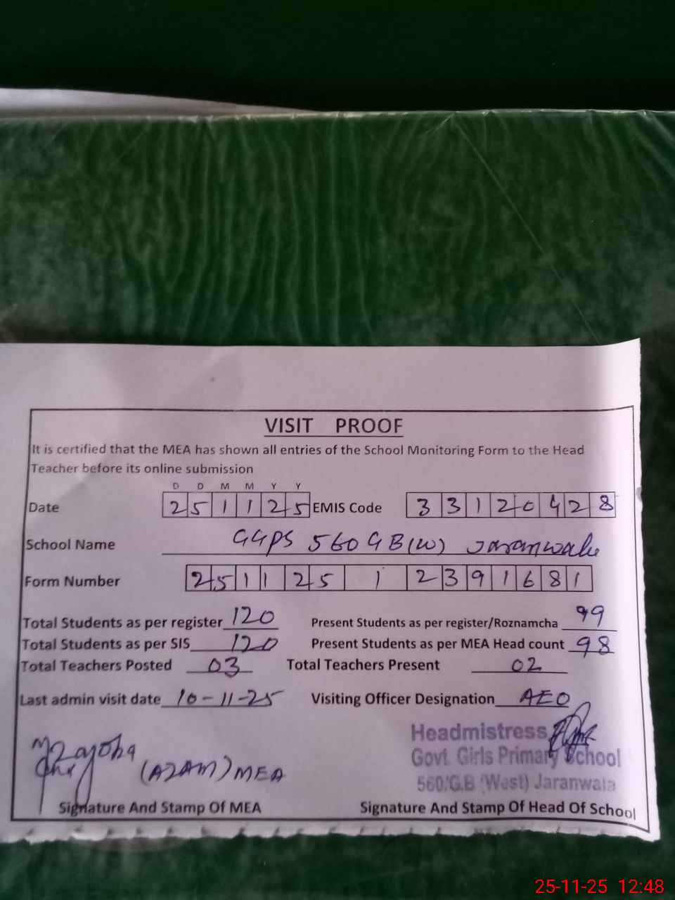 | Attendance Register | Head Teacher | MEA with School | Visit Proof |