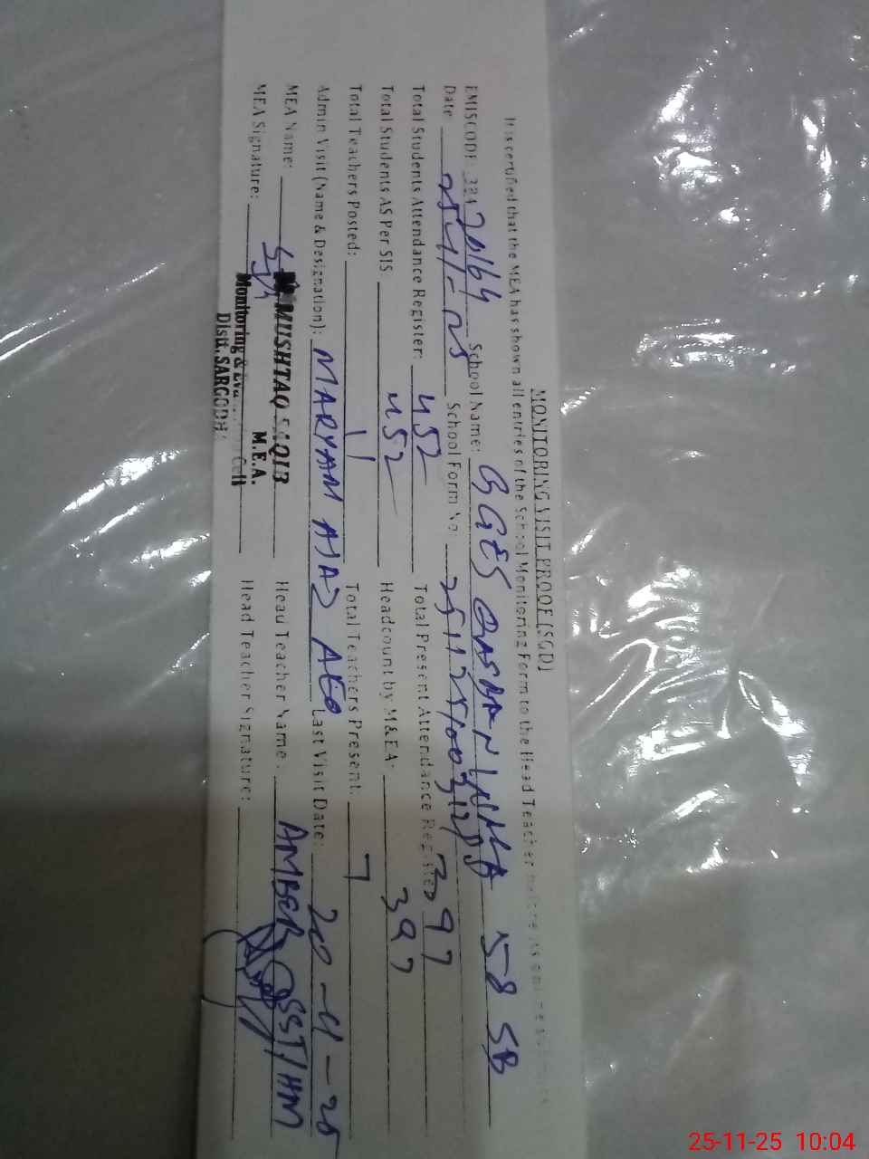 | Attendance Register | Head Teacher | MEA with School | Visit Proof |