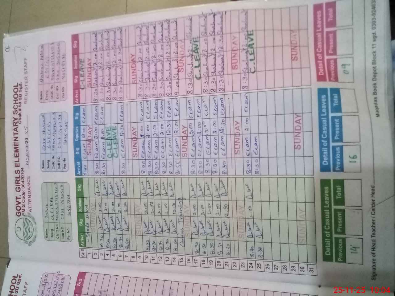| CNIC | Full Name | Designation | R/C | Absence During Last Calender Month |