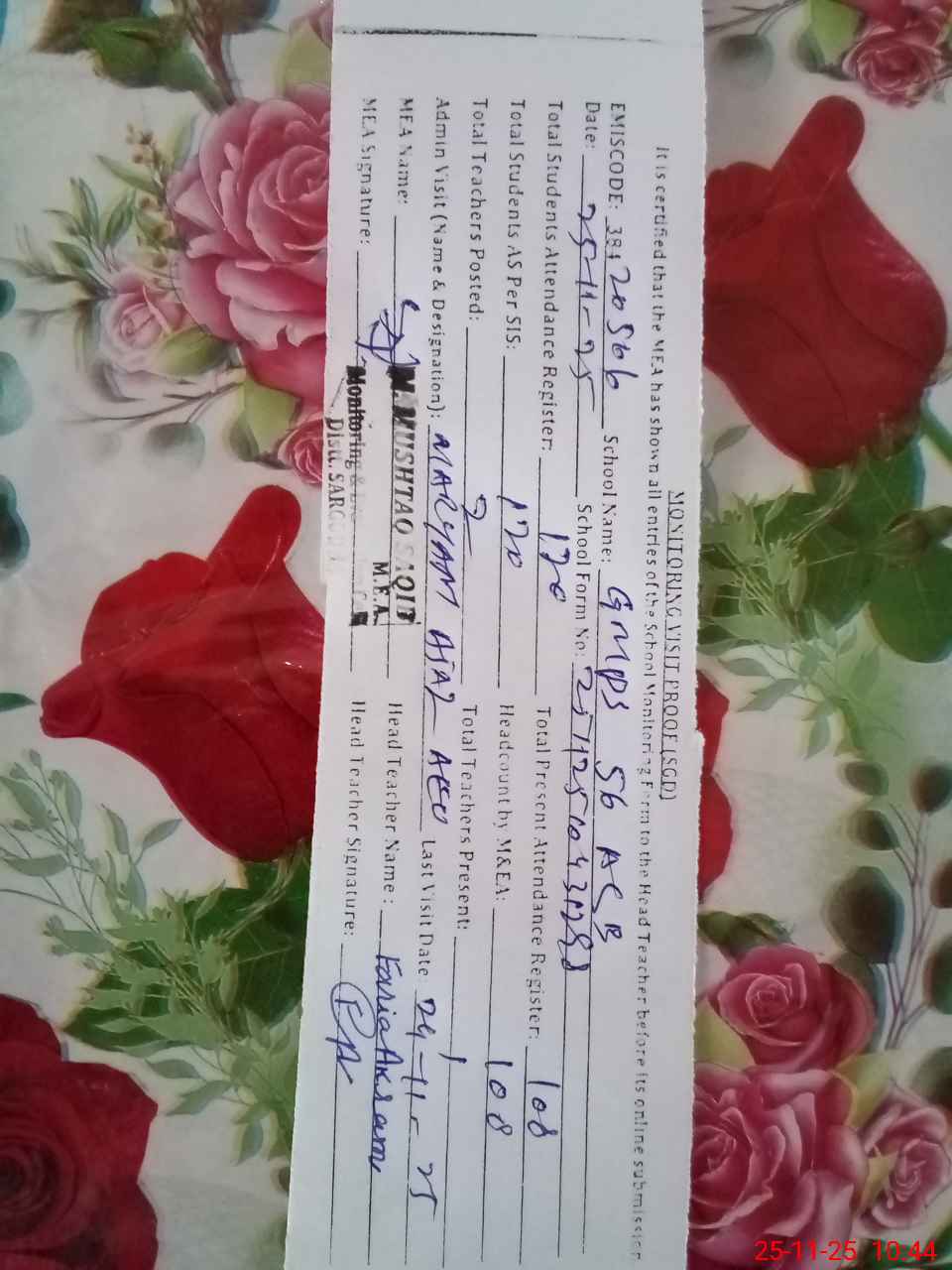 | Attendance Register | Head Teacher | MEA with School | Visit Proof |