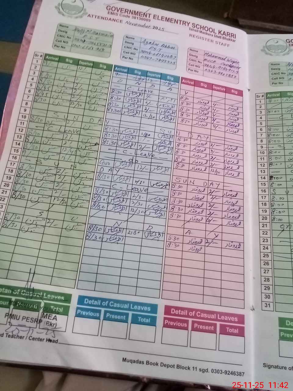 | CNIC | Full Name | Designation | R/C | Absence During Last Calender Month |