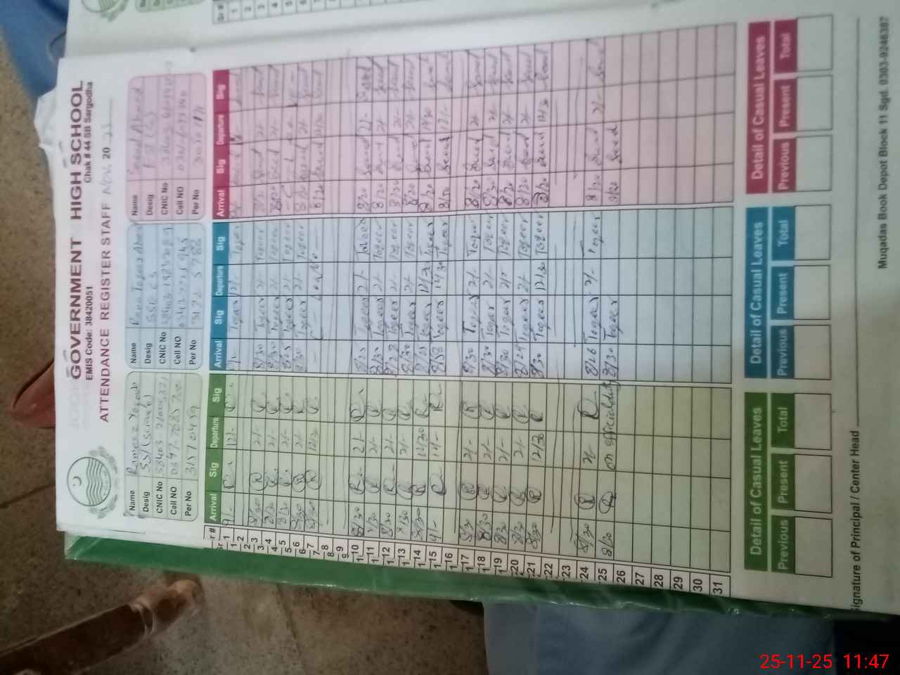 | CNIC | Full Name | Designation | R/C | Absence during last cal. month |
