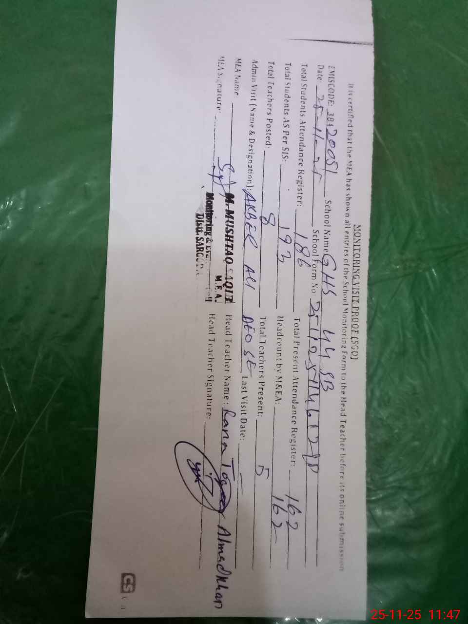 | Attendance Register | Head Teacher | MEA with School | Visit Proof |