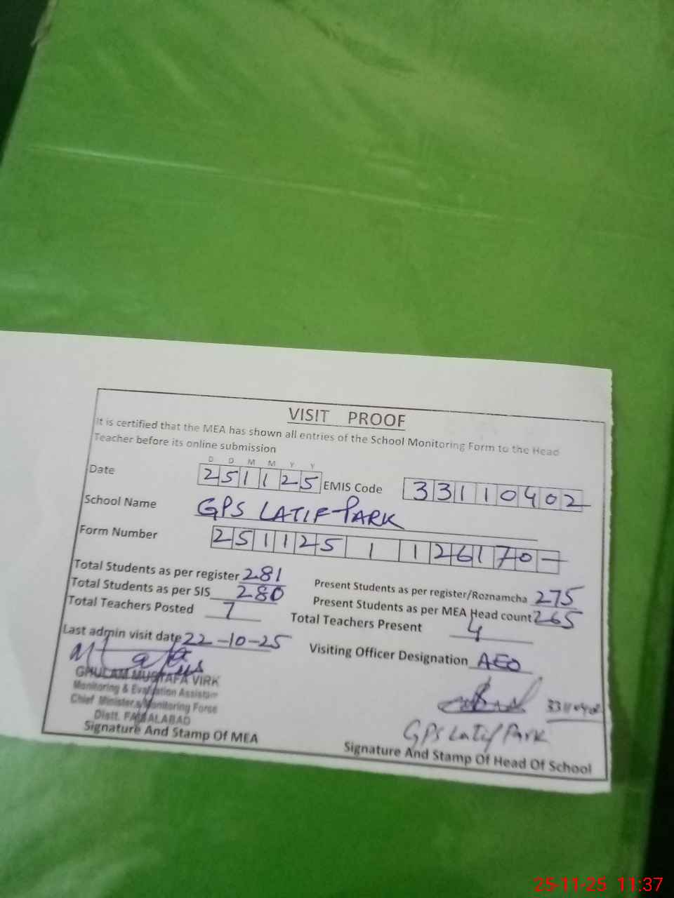 | EMIS Code: 33110402 | Name of School: GPS LATIF PARK | |||