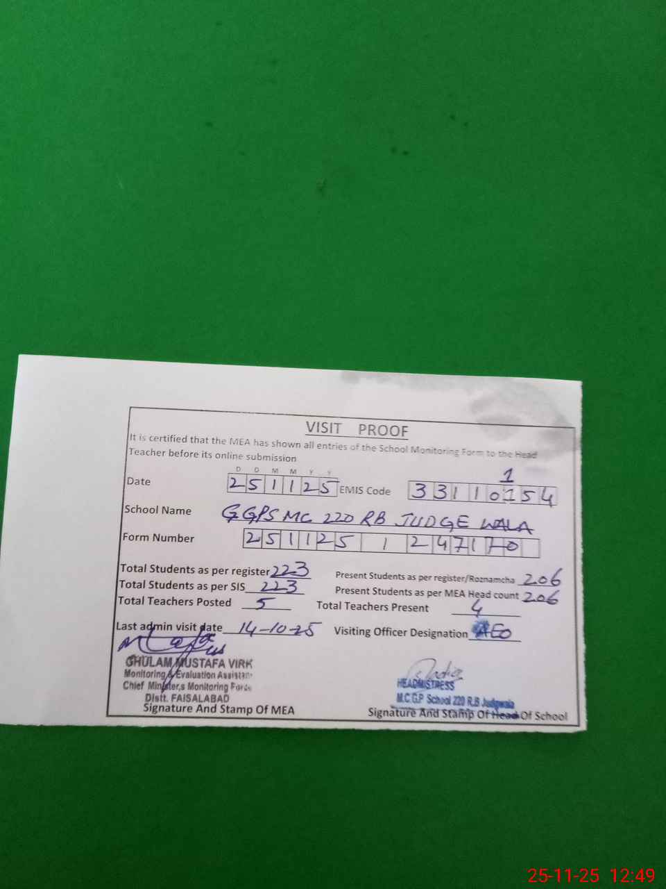 | Attendance Register | Head Teacher | MEA with School | Visit Proof |