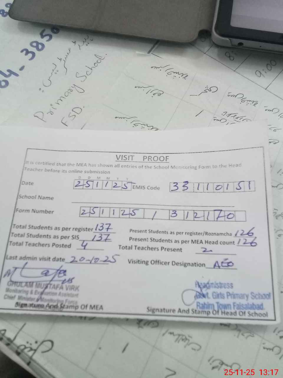 | Attendance Register | Head Teacher | MEA with School | Visit Proof |
