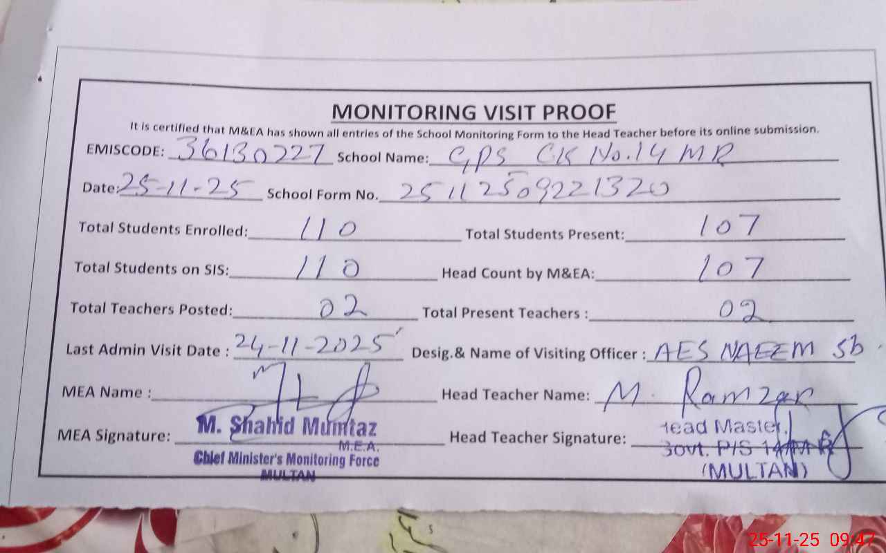| EMIS Code: 36130227 | Name of School: GPS CHAK NO.14 MR P/O MAKHDOOM RASHID | |||