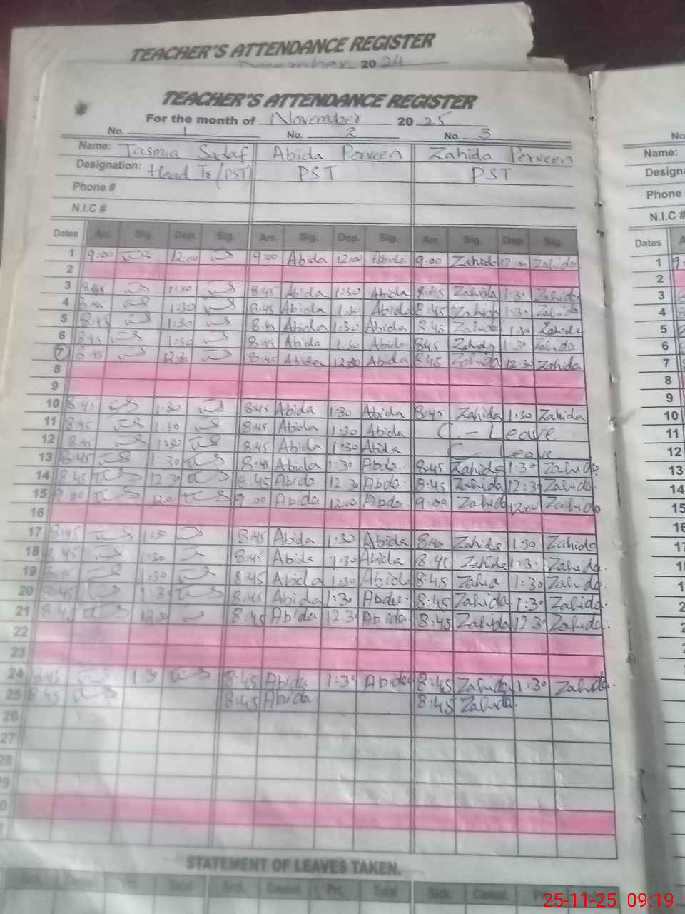 | CNIC | Full Name | Designation | R/C | Absence During Last Calender Month |