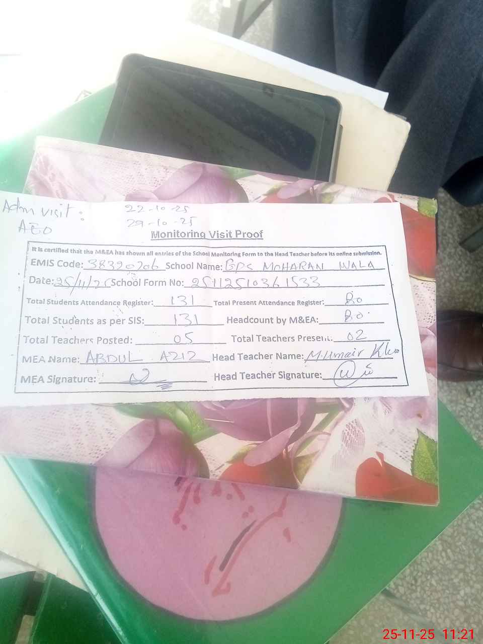 | Attendance Register | Head Teacher | MEA with School | Visit Proof |