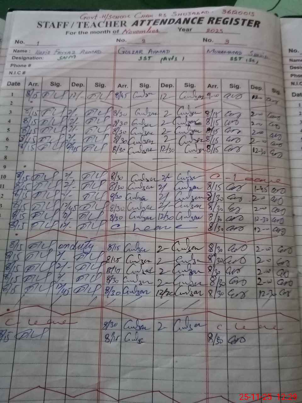 | CNIC | Full Name | Designation | R/C | Absence during last cal. month |