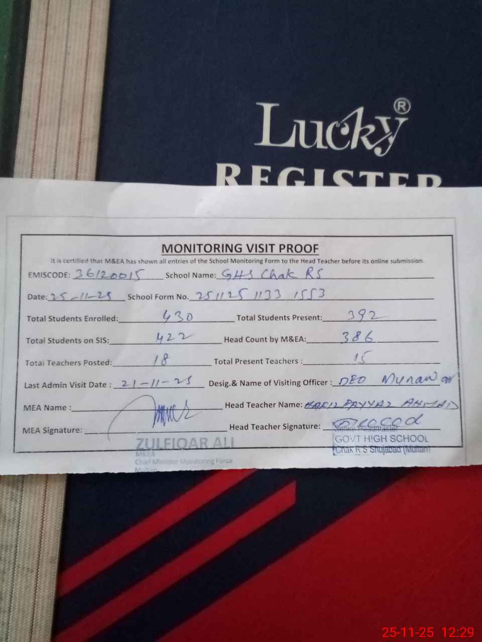 | Attendance Register | Head Teacher | MEA with School | Visit Proof |
