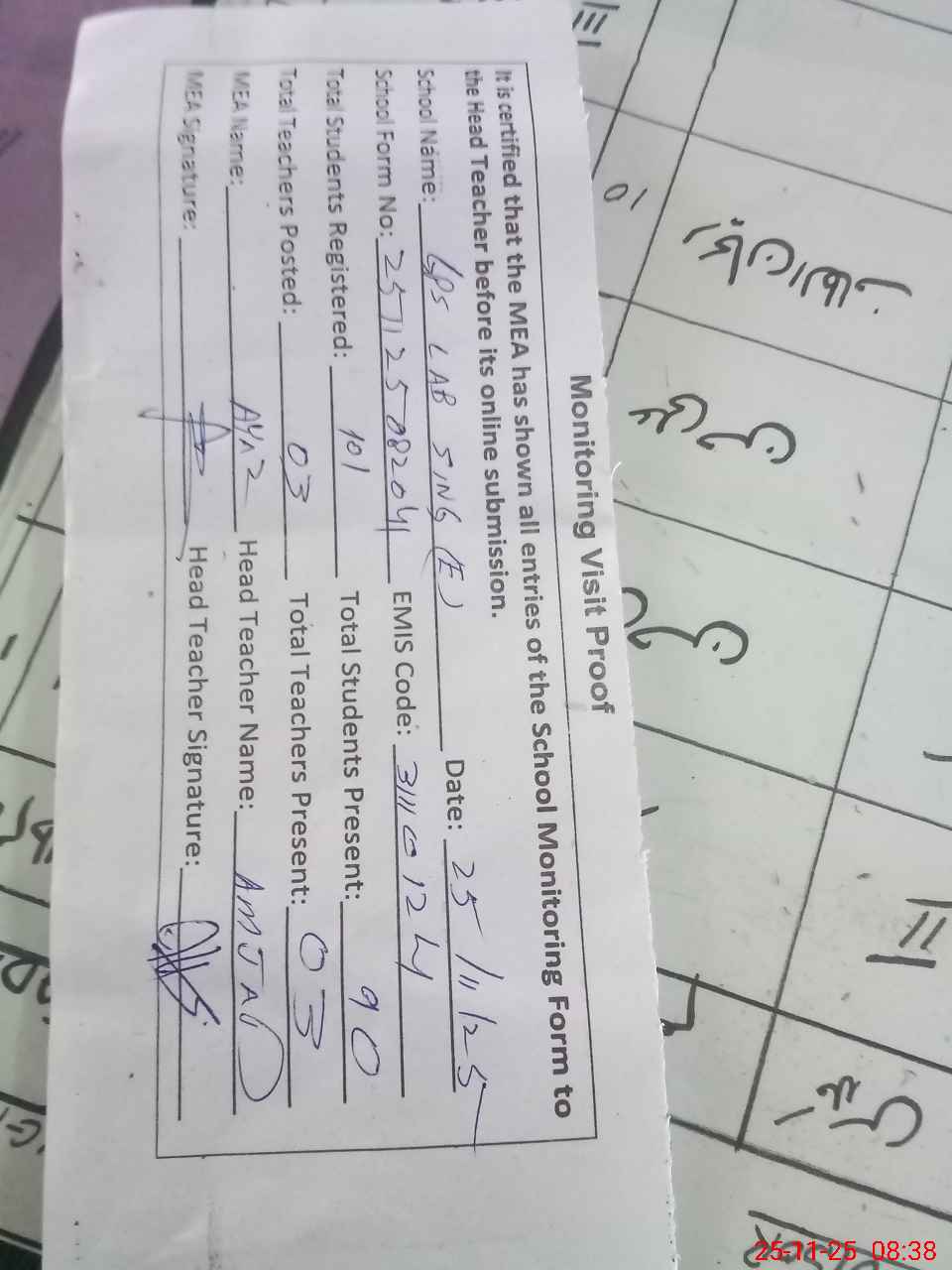 | Attendance Register | Head Teacher | MEA with School | Visit Proof |