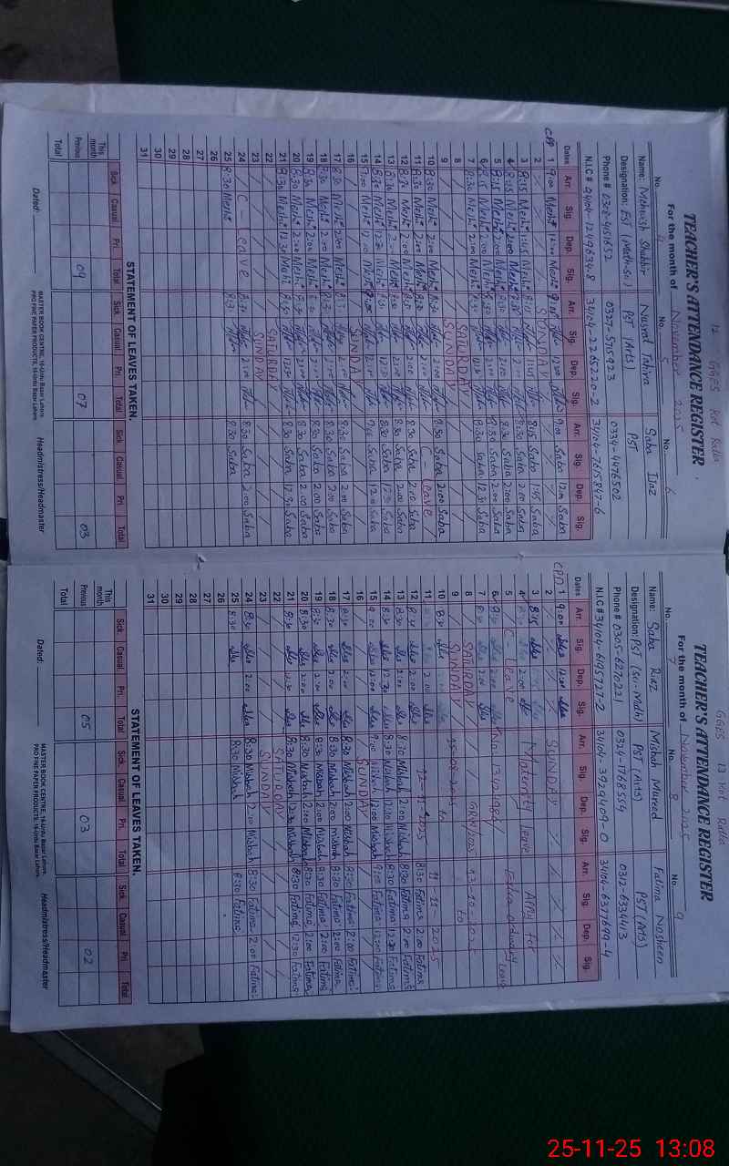 | CNIC | Full Name | Designation | R/C | Absence During Last Calender Month |
