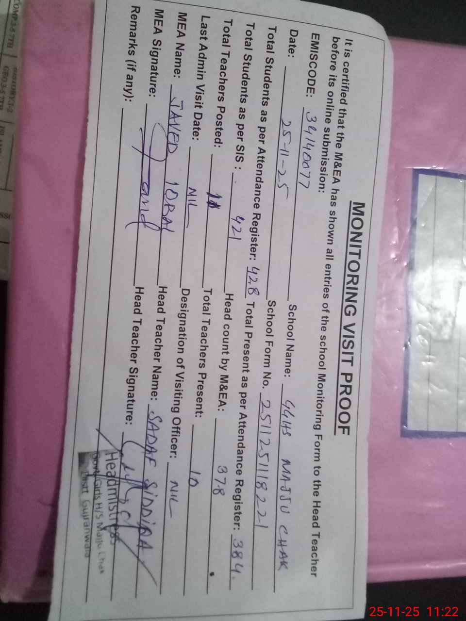 | Attendance Register | Head Teacher | MEA with School | Visit Proof |