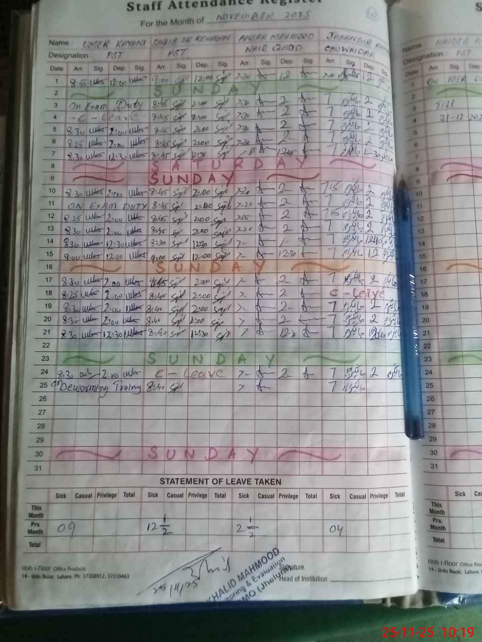 | CNIC | Full Name | Designation | R/C | Absence During Last Calender Month |