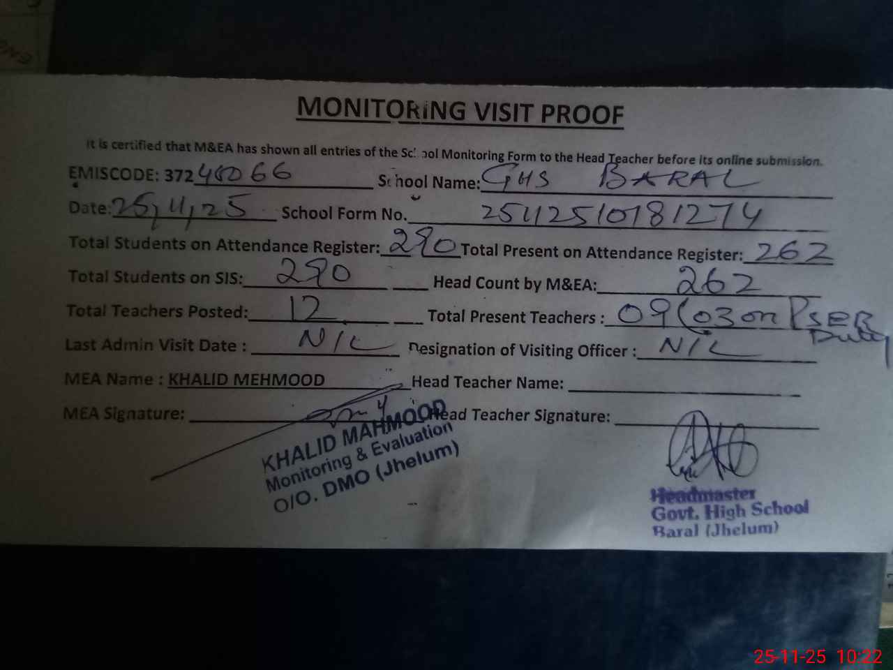| Attendance Register | Head Teacher | MEA with School | Visit Proof |