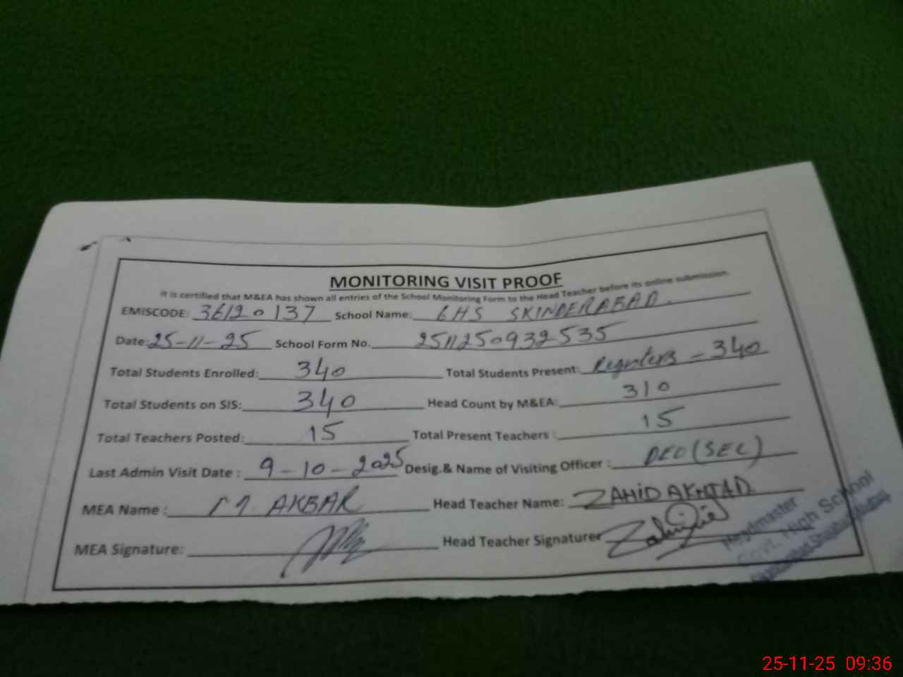 | Certified that this School was Inspected by the Undersigned MEA/DMO Today and the Information Stated Above is as Per Record. | |||||