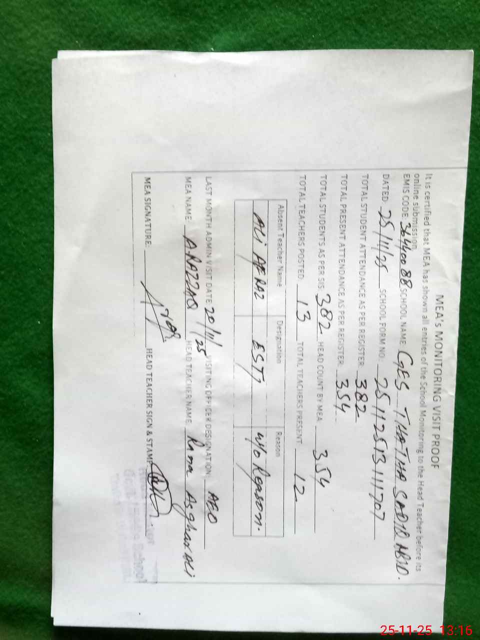 | Attendance Register | Head Teacher | MEA with School | Visit Proof |