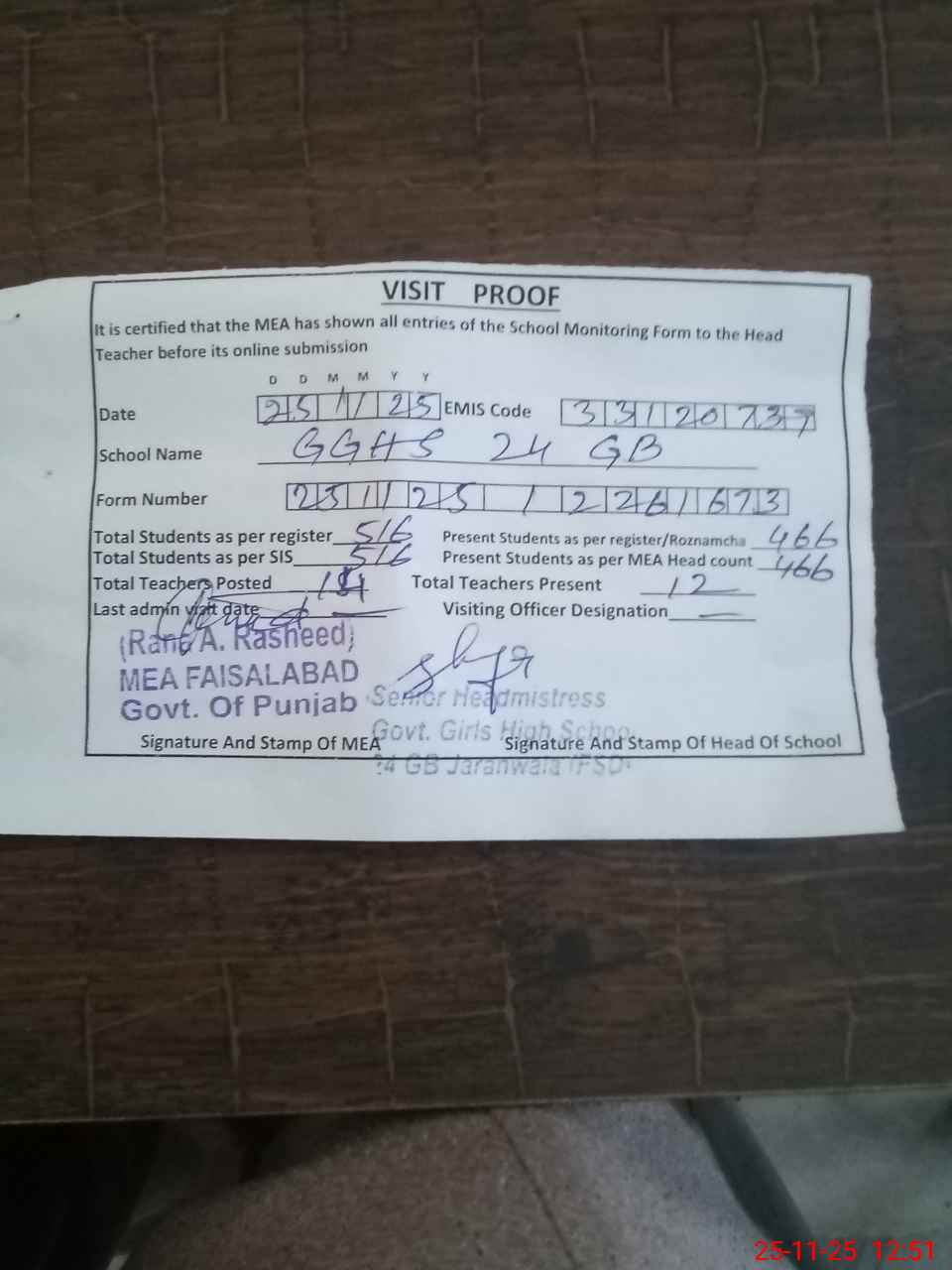 | Attendance Register | Head Teacher | MEA with School | Visit Proof |