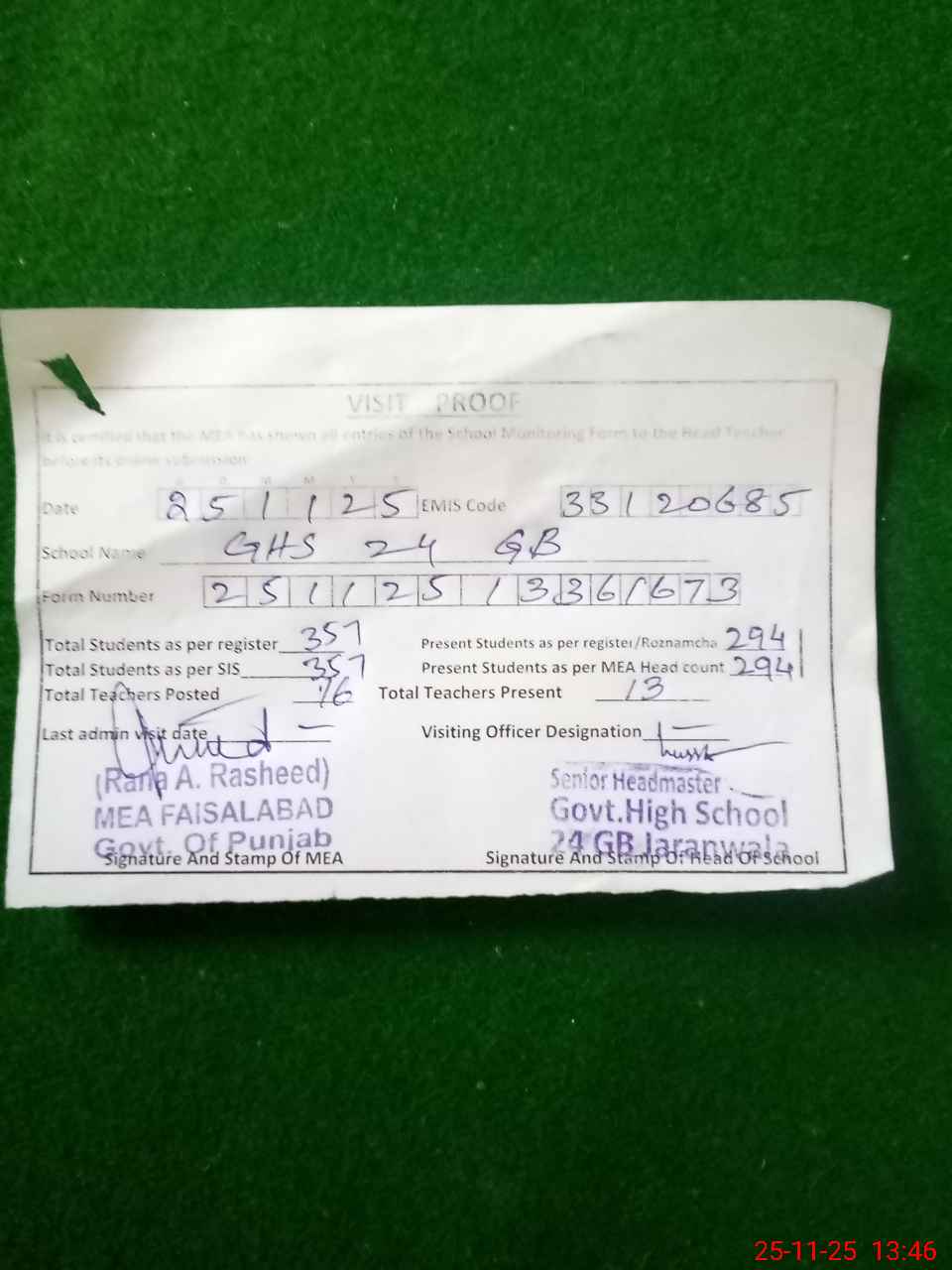| Attendance Register | Head Teacher | MEA with School | Visit Proof |