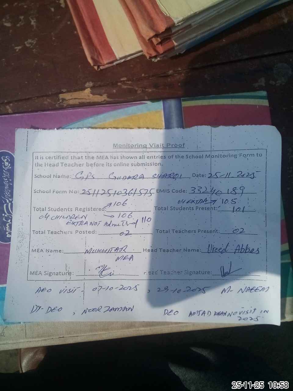 | Attendance Register | Head Teacher | MEA with School | Visit Proof |