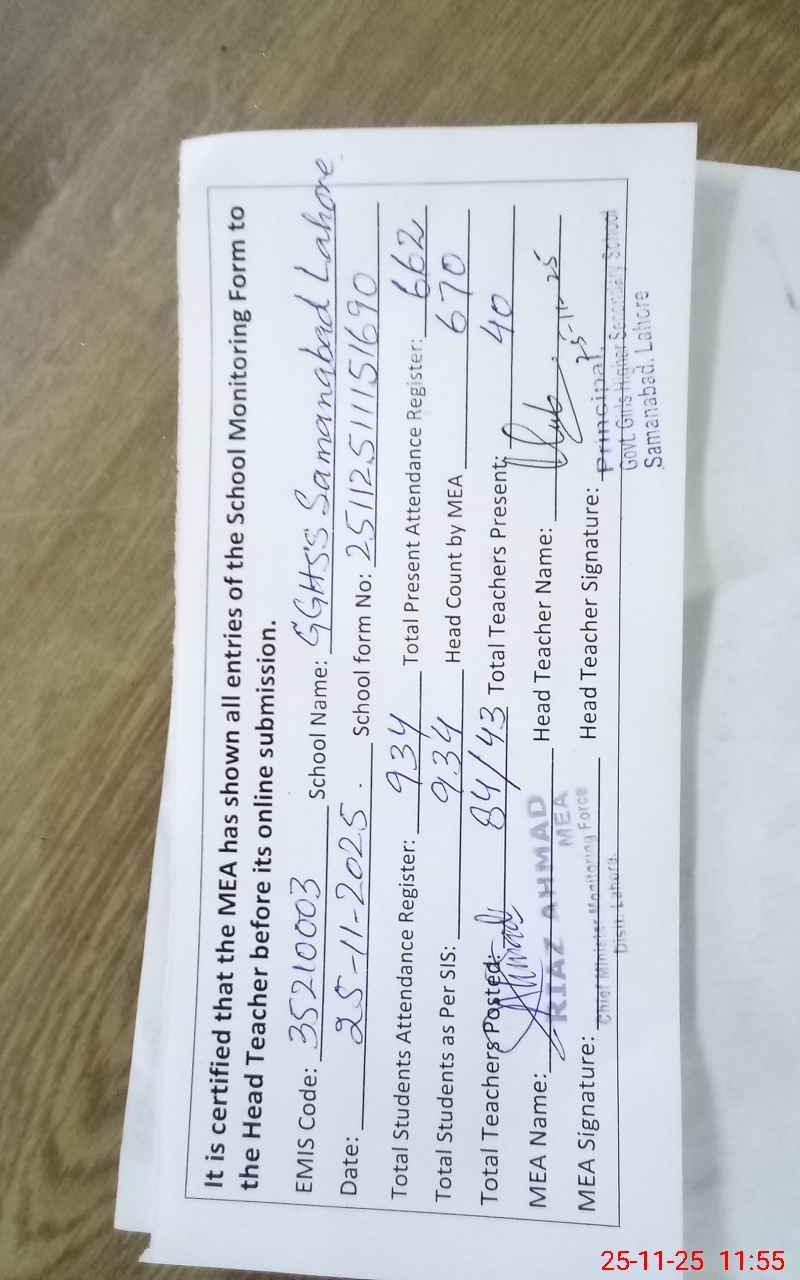 | Remarks (Use Separate Page if Required): Deputy secretary education visited this school for recent security measures by the government on 20 November 2025 DEO visited on 09 October 2025 AEO. visited on 04 November 2025 seven class received incomplete books sets | |||||