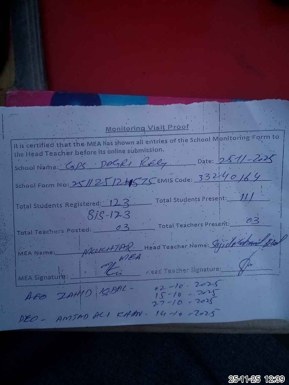 | Attendance Register | Head Teacher | MEA with School | Visit Proof |