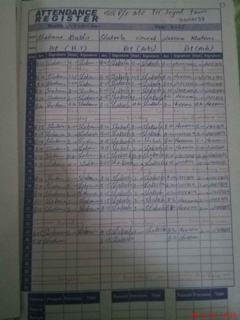 | CNIC | Full Name | Designation | R/C | Absence During Last Calender Month |